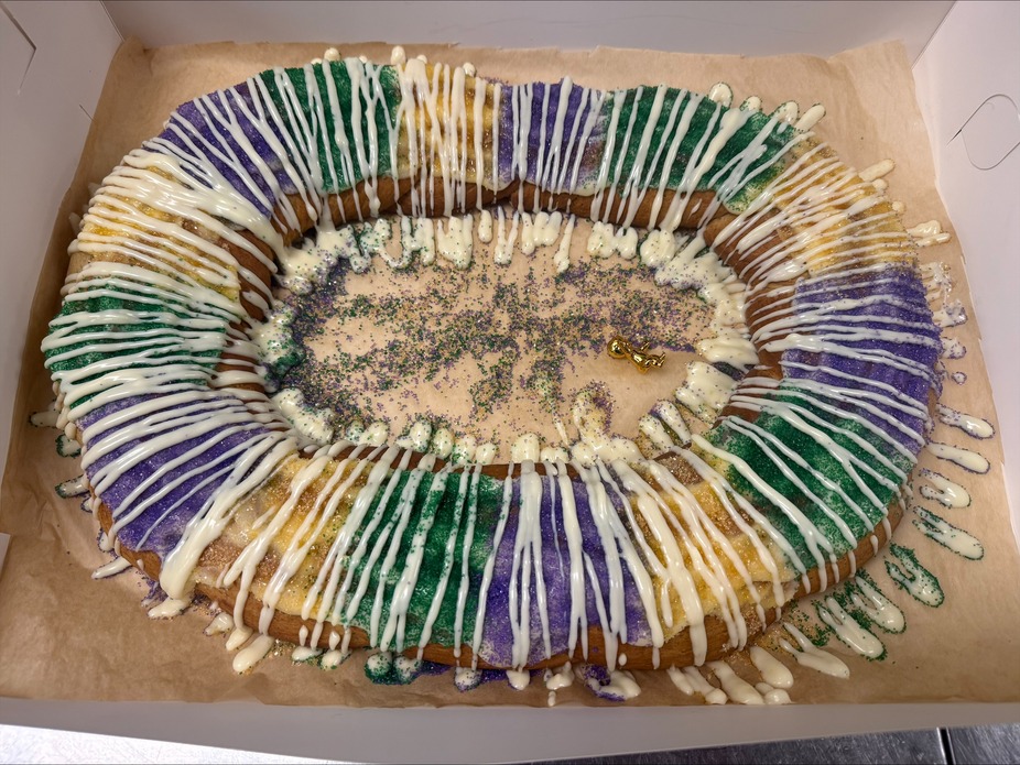 Try one of our fresh baked King Cakes smothered in cream cheese frosting and dressed up with sprinkles. Comes with a plastic baby to put in the cake. We require 48hrs notice as we will be making these to order. You can pay online or give us a call. *** You must call us to specify what day and time you want to pick up. No pickups on Mondays***